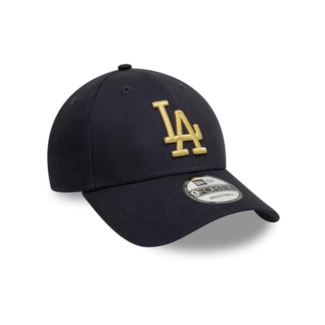 【 カラー】ネイビー x ゴールド 。フロントにはロサンゼルス ドジャースのLAロゴ、左サイドにはニューエラフラッグの刺繍ロゴが入ります。