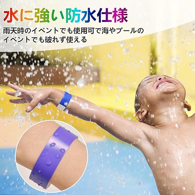 ▲【水濡れにも強い】防水性に優れた合成紙のリストバンドですので、海や川、プールや温泉などの絶対に濡れる状況での使用にも効果を発揮いたします。海の家やプールなどでの入退場管理用、スポーツクラブでの一日体験者用、温泉施設などでのコース分け用等、様々なシチュエーションでチケットバンドが活躍いたします。
