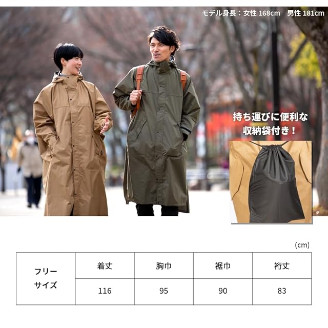 フルオープンできる前開きファスナーを設置し、脱ぎ着を楽にしました。ゆったりの身幅でリュックを中に背負うこともできるので、急な雨でもさっと着用が可能です(バッグの大きさによっては着用できない場合もございます)。持ち運びに便利な収納袋付きです。