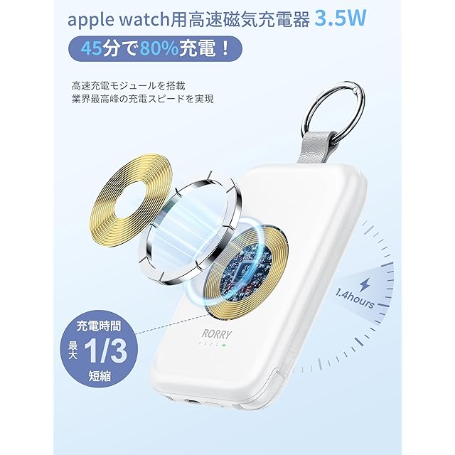 【For apple watch 本気的な高速磁気充電器に進化】RORRY進化版モバイルバッテリーはApple Watchに高速充電できるように改善しました。Apple Watch専用の高速充電モジュールを搭載され、45分程度でバッテリーの残量が0%から80%になります。つまり、容量倍増だけではなく、アップルウォッチへの充電スピードも大幅にupしました。まったく手間をかけずにApple Watchを急速充電できます。電池切れを心配なく、短い時間を活用して、Apple Watch電池が満タンの状態に回復できます。また、あっぷるうぉっち充電器は最新のosシステムに対応可能で、Watch OSがアップデートされてもご心配なく順調に充電できます。アップルウォッチ 急速充電を求めているお方には大変便利な充電器です。(高速充電に対応するのは、Apple Watch Series 10/9/8/7/Ultra/Ultra2のみです。)