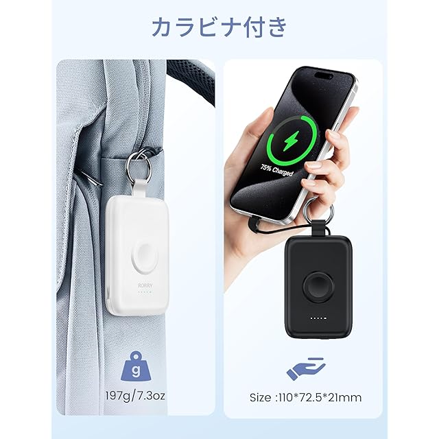 【ユニークなデザイン&カラビナ付き】一目で電池残量が確認できるように、電池残量はLEDランプに4段階で表示されております。モバイルバッテリーはテカリのないマットな質感、サイズも手のひらサイズと小型なので、ポーチやポケットにもすっきり収まります。また、持ち運びに便利なカラビナ付きで、鞄に装着して探しやすいし、紛失防止できます。しかも革製部品も付き、高級感溢れます。190gという軽さ、コンパクトさと汎用性のバランスが取れています。RORRYモバイル充電器をカバンに備えておけば出先での急な充電切れに焦らず対応でき、旅行や出張まで幅広くお使い頂けます。