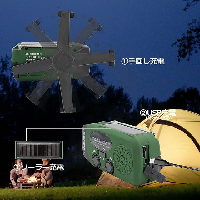 【3つの充電方法】手回し充電手回しラジオ:製品の背面にあるハンドルを回すと充電可能。ソーラー充電ラジオライト:ソーラーパネルを日差しの方向に向けると、自動的に充電可能。USBケーブルで充電:付属しているUSBケーブルでUSBポートから充電可能