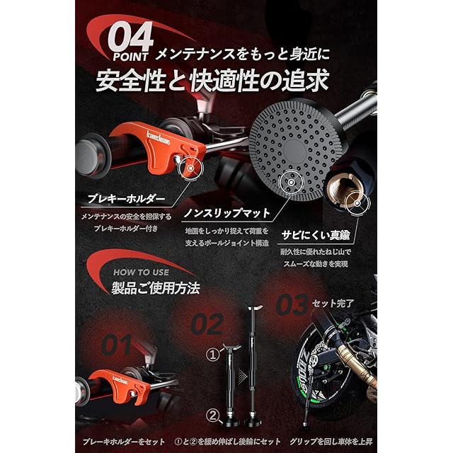 【コンセプト1】 握る工具はグリップが命、高価なドライバーなどはグリップの形状を力が掛かりやすく、回しやすい設計とすることで、通常のドライバーでは緩められなボルトも緩めることができるようにしています。Kaedearではグリップスタンドと命名し、本体中央にグリップ形状に設計しています。【コンセプト2】 工具はストロークが細かいほど良い。穴にドライバーを差して回す行為は整備学的に禁止行為で、コンクールなどでは危険行為として減点対象になります。またかけ返しが180度となり力も伝わりにくく、重たい場合も手で頑張って回すことに。そこで本体上下に六角ポイントを設計することでスパナで60度毎のかけ返しが可能になります。力も加わりやすいので、より軽く上昇させる事が可能です。早回しスパナや板ラチェを仕込めば更に快適にお使い頂けます。【ビジュアル&セーフティー】 目立つ色は工具の置忘れなどを防止するだけでなく、第三者に車両の状態を認識させる上でとても重要です。ブレーキホルダーとグリップスタンドにも目立つ赤のラインナップを用意しました。