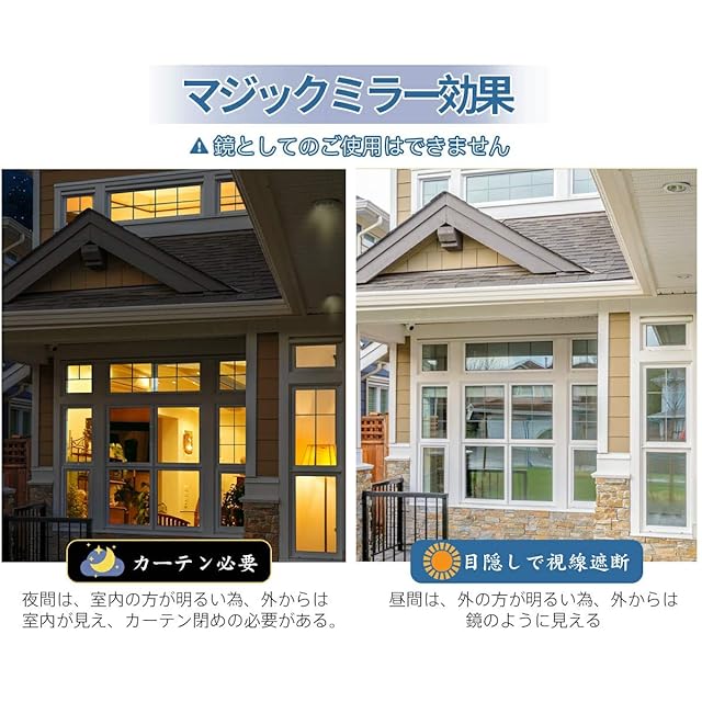 【透明ガラスの目隠し、プライバシー保護、防犯シート】外からの視線を遮りながら、充分に外の光を室内に取り込めます。窓ガラス用防犯フィルムとして使えます。ただし、このフィルムはマジックミラー効果あります、マジックミラーとは明るい側から暗い側は透視できないが、その逆は可能な鏡のこと(そのため昼夜見える側が逆転します)