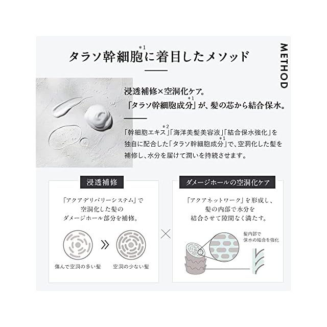 幹細胞エキス*と、海洋由来成分などを贅沢に配合した「タラソ幹細胞処方」の美容液シャンプーと美容液トリートメント。ダメージを受けたパサつきがちな髪に、水分を届けて束縛。乾燥しがちな頭皮も保湿して美髪作りをサポートし、髪がぷるんと潤い毛先までしっとりまとまります。キメ細やかでクリーミーな泡立ちのシャンプーが、頭皮と髪の汚れを優しく落としながら潤いを与えます。さらに美容液をリッチに配合したトリートメントで、ダメージによる毛髪の空洞化とキューティクルの剥がれを補修。使い続けるほど、髪の水分と油分のバランスを整え、潤いに満ちた「ぷるん髪」へと導きます。心地よく香るやさしいアクアホワイトフローラルの香り。* クリスマムマリチマムカルス培養液、リンゴ果実培養細胞エキス、ブドウ果実細胞エキス、アルガニアスピノサカルス培養エキス(全て保湿)