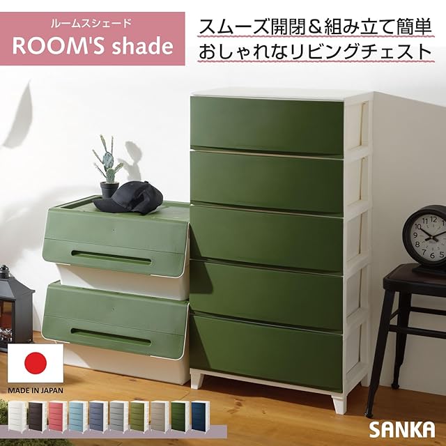 【web限定カラー】 サンカ ルームス 収納 チェスト カーキ ワイド 5段 (幅54×奥行42×高さ107cm) スルっと引き出せて スキッと締まる引き出し キズ付きにくいマット加工パネル 簡単組み立て 日本製 衣装ケース タンス ROOM'S shade squ+ ARSD-S545KK