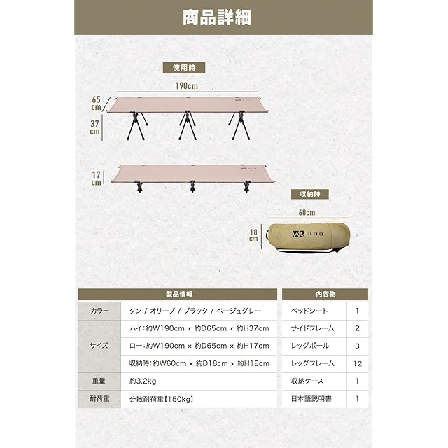 【スペック詳細】・600Dナイロン仕様・耐荷重[150kg]・幅広ゆったりサイズ・ハイ/ロー2way仕様・持ち運び簡単収納バッグ付き【製品サイズ】・使用時/長さ(約)190cm x 幅(約)65cm x 高さ[ハイ](約)37cm[ロー](約)17cm・収納袋サイズ/横(約)60cm x 幅(約18cm) x 高さ(約18cm) 【セット内容】コット生地×1 レッグフレーム ×3 レッグポール×12 収納袋 ×1