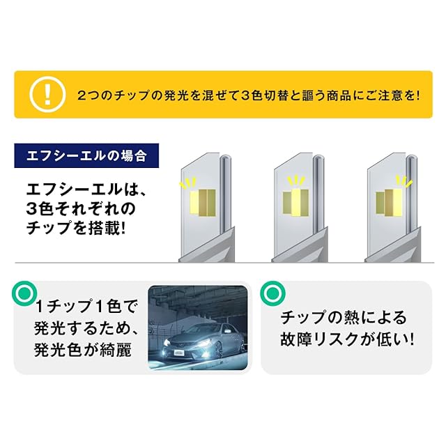 エフシーエルのカラーチェンジシリーズから新登場!待望の3色切替 トリプルカラーチェンジ LEDフォグランプ!既に2色切替を試したことがある方、フォグのカラー選択でお悩みの方、遊び心も忘れたくない方におすすめ。3色展開で様々なカラーにチャレンジしやすくなりました。王道カラーのホワイト(白色)、視認性の良いライムイエロー、チャレンジカラーとしてイエロー(黄色)とフロスティブルー(青)、そして新色アンバー(オレンジ)をご用意。他の3色LEDバルブとは違う、独自のチップ配置、発光の仕組みでこれまでにないフォグ体験をあなたに!バルブ形状には、h8 h11 h16 hb4 ハイエース用のpsx26wの左右セット。後付けタイプの商品のため、幅広い車種に対応した汎用品です。毎日をカラフルに!日常に遊び心を!fclのトリチェンで新時代をいくフォグランプを。