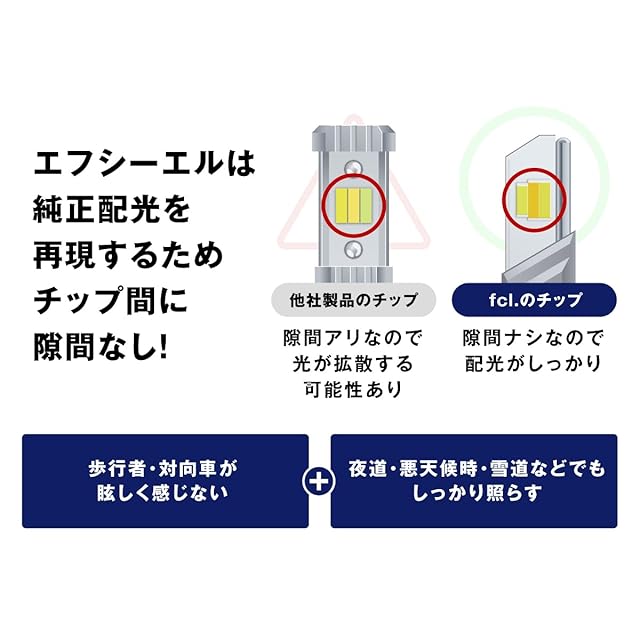 【対向車に優しい純正同等配光】純正ハロゲンの発光点を忠実に再現するため、LEDチップ間の隙間を極限までなくしました。これにより、カットラインがくっきりと生まれ、対向車や歩行者が眩しくない、安全で快適な夜間走行をサポートします。led フォグ の交換で視認性と安全性を両立させたい方に最適です。