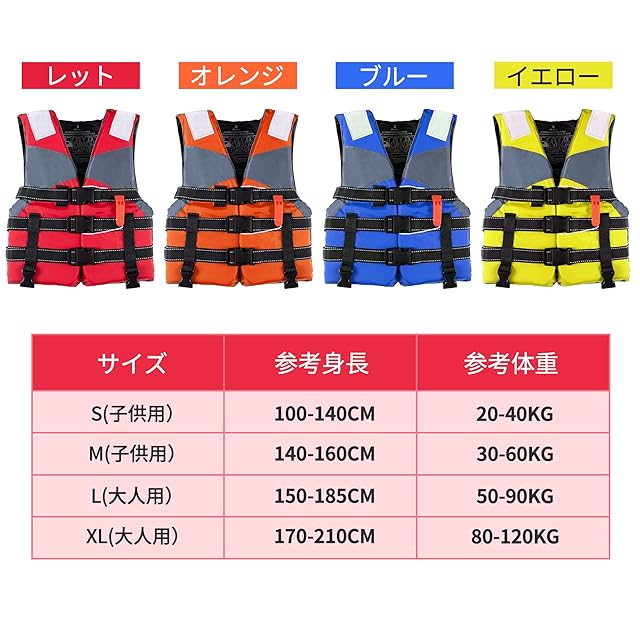 【サイズ(参考値)】青、黄色い、赤とオレンジで4色、S~XLまで4サイズ用意しておりS:100-140cm 20-40kg(子供用)、M:140-160cm 30-60kg(大人用)、L:150-185cm 50-90kg(大人用)、XL:170-210cm 80-120kg(大人用)