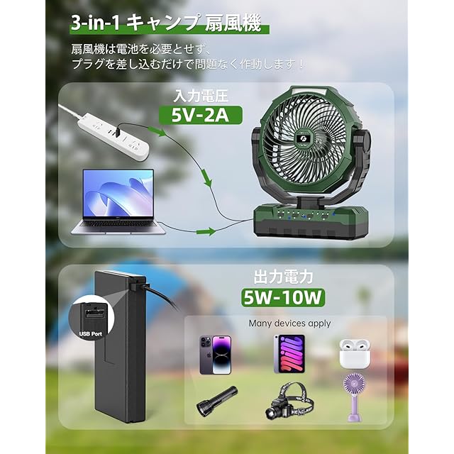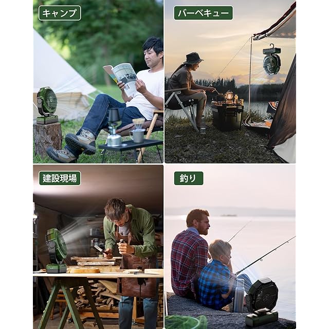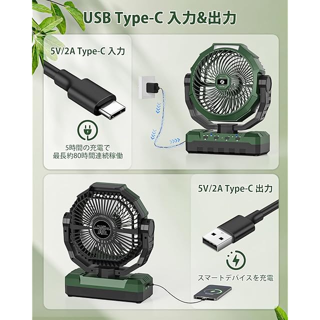 【4段階風量調節可能&モバイルバッテリーとして】キャンプ 扇風機の風力は4段階で切り替え可能。使用時はお好みに合わせて自由に風量を調節できます。また、 このキャンプ 扇風機はType-C型充電ポートを搭載しており、電力を消費している携帯電話やガジェットに簡単に電力を供給することができます。緊急停電時のキャンプ用品として最適です。