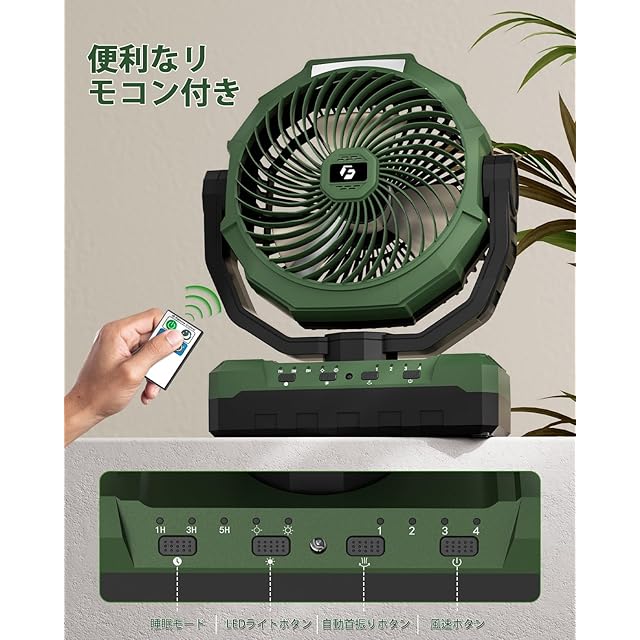 【頑丈な材質&便利なリモコン操作】 扇風機は頑丈で耐久性のある構造を採用し、落下や衝突を防ぐことができ、頑丈な台座は強力な安定性を提供し、サーキュレーターをしっかり固定させる。この扇風機は、キャンプ、釣り、ハイキング、旅行に最適です。リモコンも付属しており、6~8mの範囲でファンを操作することができます。リモコンの紛失を防ぐために扇風機の底に収納スペースをデザインしました。※リモコンを使用する前に、絶縁シートを引き抜いてご使用ください。