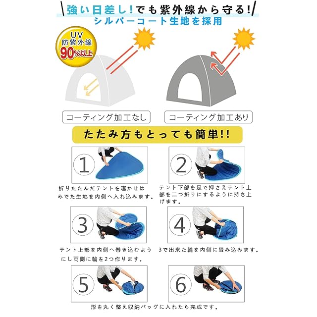 【UVカット率95%、驚き防水性】シルバーコーティングが施され、日差しを防いでくれるUV50+仕様となり、真夏の強い日差しから肌を守ってくれます、遮熱効果もあるので、暑い天気でも涼しく快適です。さらに、テントカバーは190T防水ポリエステルで耐水性があるため、多少の雨でも安心してご使用できます。