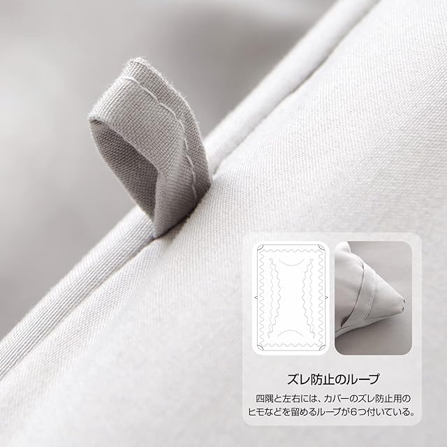 【ピーチスキン加工、やわらかくしっとり触感】肌に優しいピーチスキンの触り心地でしっとり気持ちよく、ムレにくく快適です。ほこりが出にくい、綿切れしにくい、中空ポリエステル綿を使用。ズレ防止ループ付き端の8ヶ所にズレ防止用ループが付いているので、お布団がズレる心配もありません。