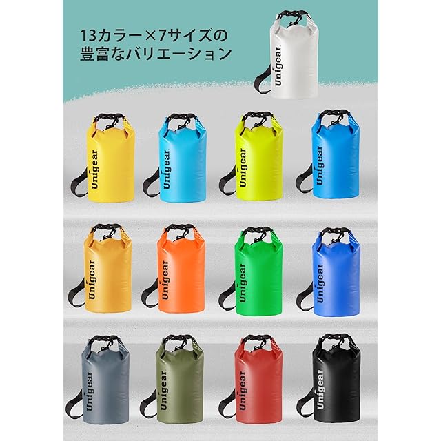 【100%防水仕様】Unigearドライバッグ生地に500ÐのPVCクリップメッシュを採用し高い防水性を実現。高周波溶接シーム技術でしっかり接着。すき間から水の侵入なども心配無用です。【操作しやすい】ロールトップ式だから入り口を折ってバックルを留めるだけ!簡単操作で汚れ、ホコリ、砂や水などからしっかりと守ります。スイミングやバイクツーリングなど多用途にご利用いただける防水ドライバッグです。登山、キャンプ、海水浴、海遊び、サーフィン、カヤック、ボート、温泉、ラフティング、釣り、水泳、スノーボードなどにも大活躍します。