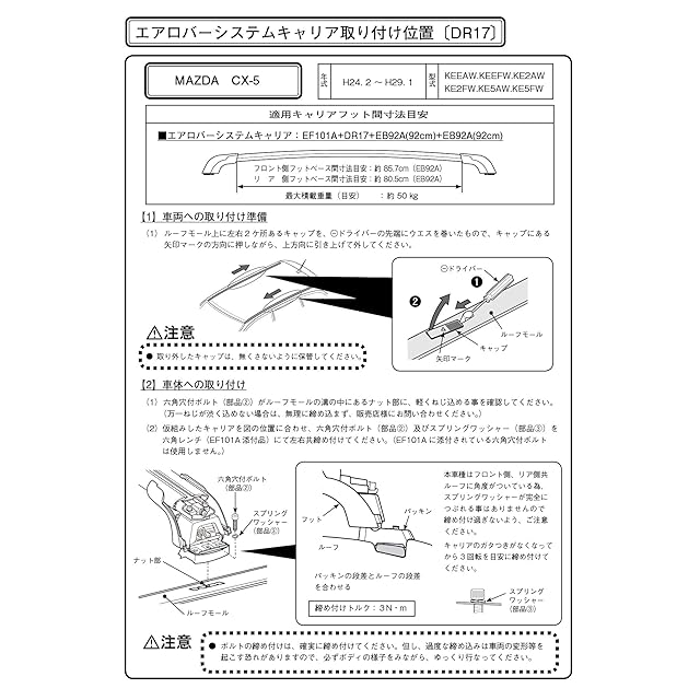 適用車種1:MAZDA CX-5(ルーフレール無車) 【年式:H 29.2~ /型式: KFEP.KF2P.KF5P】、MAZDA フレア 【年式:H30.11~/型式:MJ55S】、他車種
