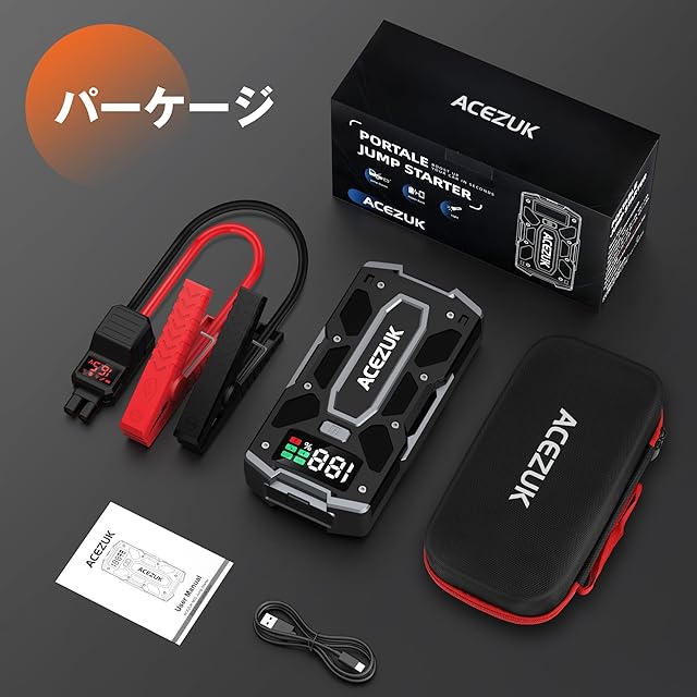 【パッケージ&保障】パッケージ内容:車用ジャンプスターター*1・ジャンパーケーブル*1・USB-C急速充電ケーブル*1・取扱説明書*1・収納袋*1。ACEZUK製品は購入後30日以内返品・12ヶ月・生涯の24時間カスタマーサービスが付いています。商品についてご質問があれば、いつでもお気軽にご連絡ください。(連絡方法1:注文履歴にアクセスして、該当する注文の右側に表示される出品者に連絡ボタンをクリックします。連絡方法2: ACEZUKカスタマーサービスメール。)