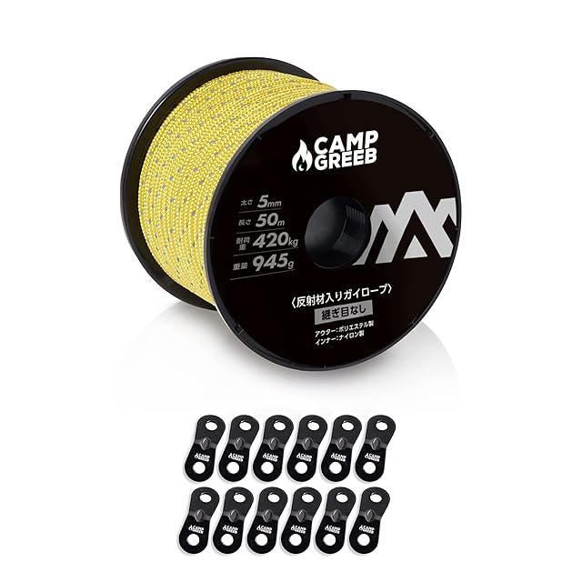 キャンプグリーブ 反射材入りパラコード 3mm/4mm/5mm ガイロープ 30m/50m巻 耐荷重240kg/350kg/420kg 自在金具12個付 継ぎ目なしノーカット テントロープ キャンプ (50, イエロー/5mm)