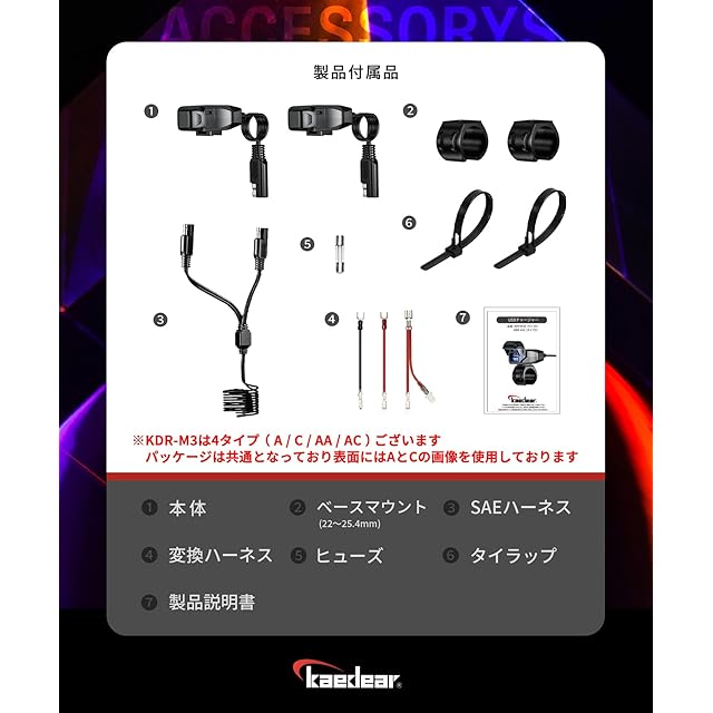 【商品仕様】 ■本体サイズ:縦52mm、横28mm、厚さ22mm ■入力電圧:12Vバッテリー車(6V-30V) ■出力電力:〔QC3.0〕5V3A/9V2A/12V1.5A〔PD〕5V3A/9V3A/12V3A(36W) ■プロテクション保護:⑴ヒートプロテクション⑵過電圧プロテクション⑶過電流プロテクション⑷ショートサーキットプロテクション ■規格:IP67、CE、FCC、ROHS ■素材:ポリカーボネート ■本体重量:30g ■セット内容:USB本体(タイプC)×2、ベースマウント(22/25.4mm)×2、タイラップ×4、SAEハーネス(Y字2コネクター)、変換ハーネス、ヒューズ、取り扱い説明書