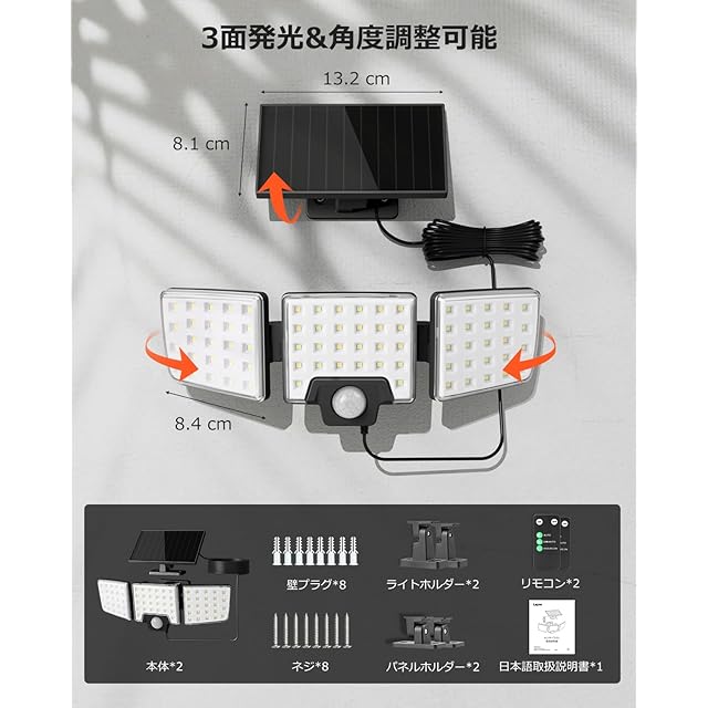 【3面発光&人感センサー点灯】3面発光デザインにより、270度の広範囲にわたって明るさを効率的に拡散します。両側のライトは角度調整が可能で、照射方向を自由に設定できます。センサーライトには高感度の光・動作検知センサーを搭載しており、夜間に人や車の動きを感知すると自動で点灯します。玄関、駐車場、庭、階段、通路、家の周りの防犯など、さまざまなシーンで大活躍します。