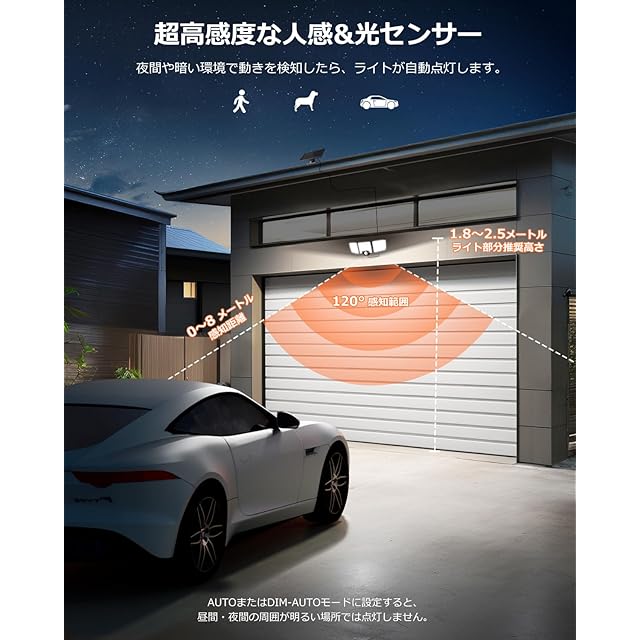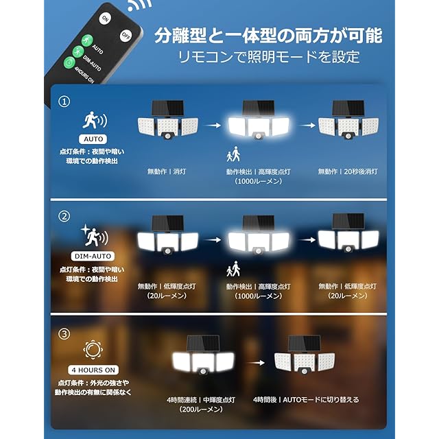 【3つ点灯モード&リモコン操作可能】リモコンで遠くから操作でき、さまざまなシーンに合わせて照明モードを簡単に切り替えられます!★①AUTOモード:夜間または暗くなるとライトが消灯状態し、人や車の動きを感知すると自動的に高輝度で点灯。動きを感知しない場合、約20秒後に消灯します。★②DIM-AUTOモード:夜間または暗くなるとライトが自動的に低輝度で点灯します。人や車の動きを感知すると自動的に高輝度に切り替わります。動きを感知しない場合、約20秒後に低輝度に戻ります。★③4 HOURS ONモード:昼夜間わず、中輝度で4時間点灯し、タイマー終了後にAUTOモードに自動切り替わります。バッテリー不足の場合、4 HOURS ONモードは継続せず、AUTOモードに切り替わります。