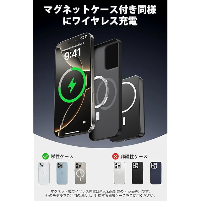【ワイヤレス急速充電&マグネット式】MagSafe磁気吸着技術を採用し、強力な磁石でiPhone 16/15/14/13/12シリーズにピタッと吸着。最大15Wのワイヤレス急速充電が可能です。Qi対応スマートフォンも対応しますが、MagSafe対応ケースの使用を推奨。充電効率向上のため、ケースを外しての使用がおすすめです。