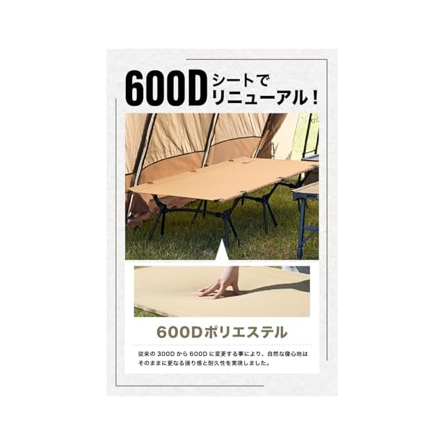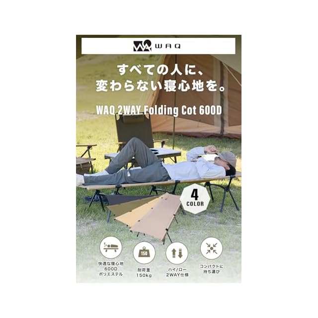 WAQ 2WAY キャンプ コット 静音 軽量 折りたたみベッド 耐荷重150kg ハイ/ロー切替可能 (タン) -600Dシート