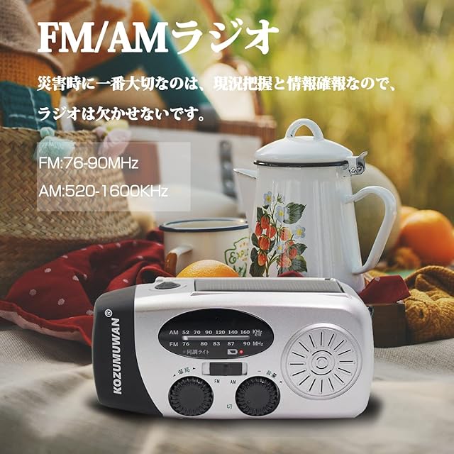 【3つの充電方法】 手回し充電手回しラジオ:製品の背面にあるハンドルを回すと充電可能。ソーラー充電ラジオライト:ソーラーパネルを日差しの方向に向けると、自動的に充電可能 USBケーブルで充電:付属しているUSBケーブルでUSBポートから充電可能