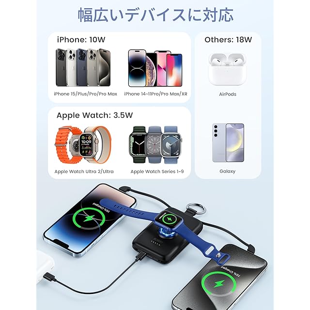 【2本ケーブル内蔵 20W & パススルー対応】Type-cとiphone用急速充電ケーブルが内蔵されており、USB-Cポートとapple watch 充電器を合わせて最大4台の機器を同時に充電することができ、パワーのある究極のモバイルバッテリーです。iPhone/Android/ゲーム機などデバイスに対応し、幅広い機種に対応できます。内蔵ケーブルにも断線に強い高耐久加工済み、ケーブルを末永くご利用いただけます。また、Type-C端子からモバイルバッテリー本体に蓄電できますし、パススルーにも対応しておりますので、モバイルバッテリーを充電しながらApple Watchなども充電できます。夜にセットして、朝起きたら全部フル充電完了です。