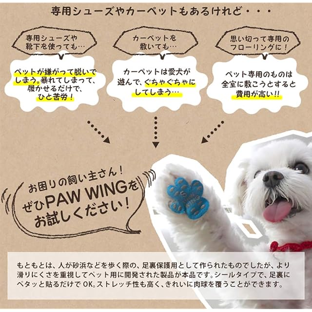 専用シューズやカーペットもあるけれど…フローリングの滑り止め対策として、ペット用シューズやカーペット、専用フローリングなどの選択肢はありますが、専用シューズや靴下を使っても…ペットが嫌がって脱いでしまう。暴れてしまって、履かせるだけでひと苦労!カーペットを敷いても…カーペットは愛犬が遊んで、ぐちゃぐちゃにしてしまう。。。思い切って専用のフローリングにすると…大切なペットのためとはいえ、全室ペット専用フローリングを敷こうとすると費用が高い!!などなど、悩みも多いですよね。そんなお困りの飼い主さんにオススメなのが、ワンちゃんの肉球に貼るだけOKの「PAW WING」なんです!