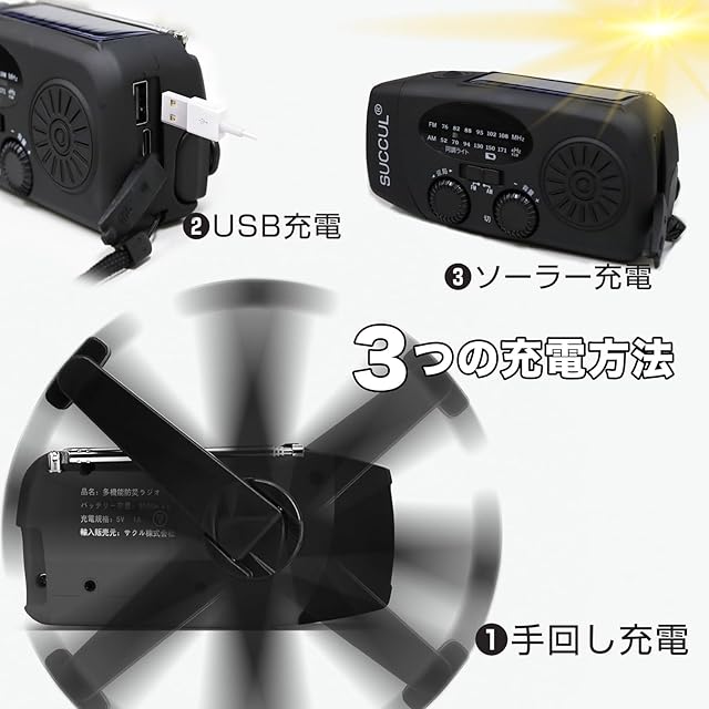 【3つの充電方法】手回し充電手回しラジオ:製品の背面にあるハンドルを回すと充電可能。ソーラー充電ラジオライト:ソーラーパネルを日差しの方向に向けると、自動的に充電可能。USBケーブルで充電:付属しているUSBケーブルでUSBポートから充電可能