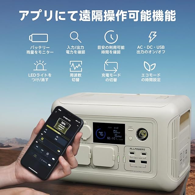 【スマホのALLPOWERSアプリから遠隔操作】ALLPOWERS R600 ポータブル蓄電池はボタン操作のほか、ALLPOWERS専用アプリからiOSデバイスでも、Androidデバイスでも、ポータブル電源R600を簡単にリモート操作できます。操作可能機能:①バッテリー残量、入力電力、出力電力及び目安の利用可能時間などの情報を確認、②AC・DC・USB出力のオン/オフ、③LEDライトをつけ/消す、④周波数切替、⑤充電モードの切替、⑥エコモードの時間設定など。
