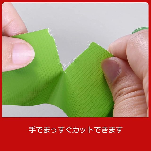 養生テープの採用基材:ポリエチレンクロス、粘着剤:アクリル油、テープの厚さ:0.16mm、粘着力:2.2N/cm(弱粘着)、引っ張強さ:30N/cm、伸び率:10%