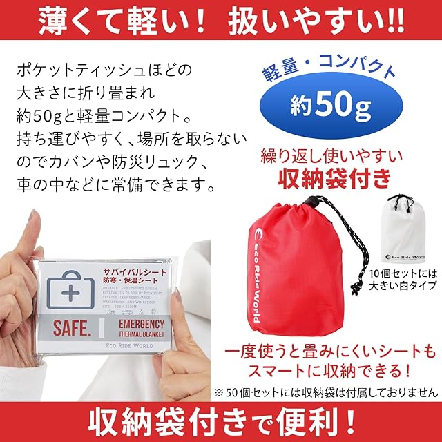 ✅緊急災害時やスポーツ観戦時などにブランケットの代用としてご使用いただける、 サバイバルシート (エマージェンシーシート EMERGENCY SHEET) です。 コンパクトに畳まれているため、かばんや防災リュック、車の中などに常備できて、持ち運びやすく場所を取りません。 広げると 210 × 130cm になりますので、毛布のように被ったり、シートやマットの下に敷いたりと様々な使い方が可能です。折りたたみ時は、縦、横どちらも 約11.5cm 以下のコンパクトな作りです。防災ガイドを付属しており、非常持出品チェックリストや緊急ダイヤルなど災害への備えについて 必要な情報が提供されています。またコンパクトに収納できるよう専用のポーチを付属しています。