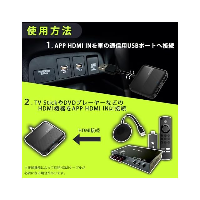 ※Fire TV Stickの電源は本製品のUSB端子に差さないでください。Fire TV Stickの電源はシガーソケット電源→USB変換電源、もしくは他USBポートより接続して電源をお取りください。 ※音飛びや、音がプツプツと切れる、フリーズするなどの症状が現れた場合、最新ファームウェアへのアップデートをお試しください。アップデート手順は取扱説明書もしくは弊社慶洋エンジニアリングのHPをご確認ください。 ※本製品は単体で動画やテレビを見ることはできません。TV stickなどのストリーミングメディアプレーヤーもしくは地デジチューナーをご用意ください。 ※運転者は走行中に操作をしないでください。前方不注意となり交通事故の原因となります。必ず安全な場所に停車してから操作してください。