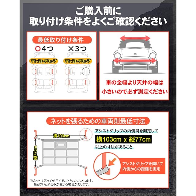 【※必ずご購入前にご確認ください】 ✅お客様のお車の天井にネットを固定できるアシストグリップ等が4箇所あること。もしくはネットが取付可能なサイドバー等があること。 ✅ 商品画像(5枚目)にある、「ご購入前に取り付け条件をよくご確認ください」を参考にされ、取付寸法がお客様の車とマッチしているか必ずご確認ください。 ✅ 天井の幅は、ボディの幅よりかなり狭くなっている車両もございますのでご注意ください。