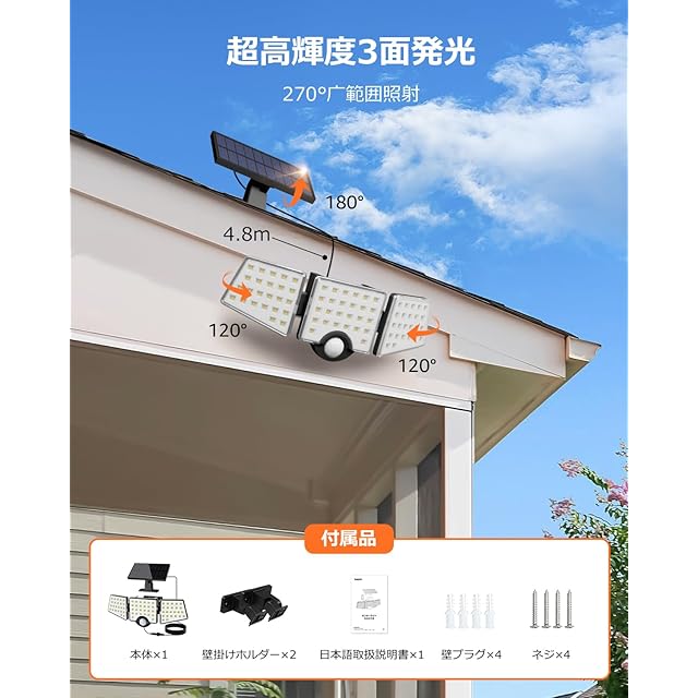 【様々なシーンで活躍&パッケージ内容】庭、廊下、軒先、ガレージ、駐車場、ポスト、ベランダ、車道、菜園、通路などの防犯対策に役立ちます。パッケージ内容:人感センサーライト本体×1、壁掛けホルダー×1、ネジ×2、壁プラグ×2、日本語取扱説明書×1 ※使用前に本体背面のON/OFFボタンを押してONにしてください。