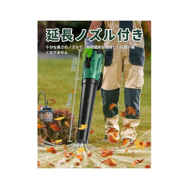 【延長ノズルと簡単な取り付け】:このエアブロワーは延長ノズルを搭載しており、付属の延長チューブを取り付けることでノズルの長さを延長でき、長時間掃除しても腰に圧迫感を感じません。(伸長後のノズル全長:55cm)。操作も簡単で工具不要で簡単に取り付けられます。ノズルを外すと約38cmでコンパクトに収納できます。さらに、コードレスの充電式ヘアドライヤーなので、どこにでも持ち運んで作業できます。