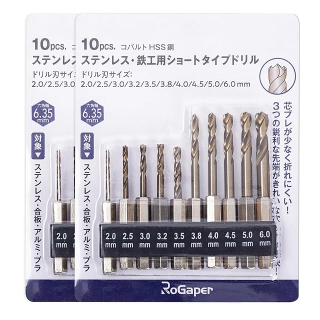 ROGAPER六角軸 2pack ステンレス・鉄用 ショートドリル 10本セット コバルトハイス鋼 チタンコーティング アソート 鉄工ドリル ステンレス用ドリル