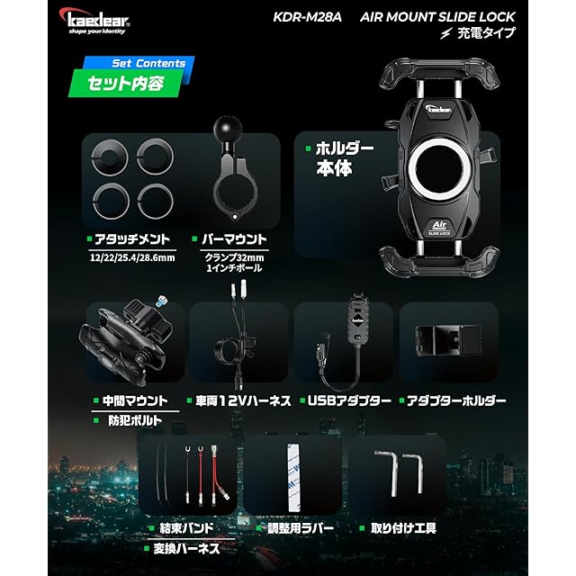 【商品仕様】 ■ホルダーサイズ:縦幅130~190mm、横幅65~85mm、厚さ17mm ■材質:アルミニウム合金(マウント)+強化プラスチックPA66+GF ■重量:450g ■セット内容:本体(1インチボール)、バーマウント(1インチボール/32mm/幅15mm)、径変換アタッチメント(12/22/25.4mm)、2mmラバーテープ、六角レンチ、60mm中間マウント(防犯タイプ/12Vアダプターホルダー付き)、12VアダプターUSB電源付き、SAEハーネス(ヒューズホルダー/ギボシ)、変換ターミナル(平型Y字/クワガタ端子)、結束バンド■取扱説明書(オンラインのみ):環境負荷の軽減を目指した脱炭素化への取り組みとして、紙媒体での同封を控えさせていただいております。Kaedear公式サイトの各商品ページから閲覧またはダウンロードが可能です。※中間マウントは六角ボルトを取り付ける事で角度調整が可能な範囲までで取り外しができなくなります。 ■ブランド:Kaedear(カエディア)