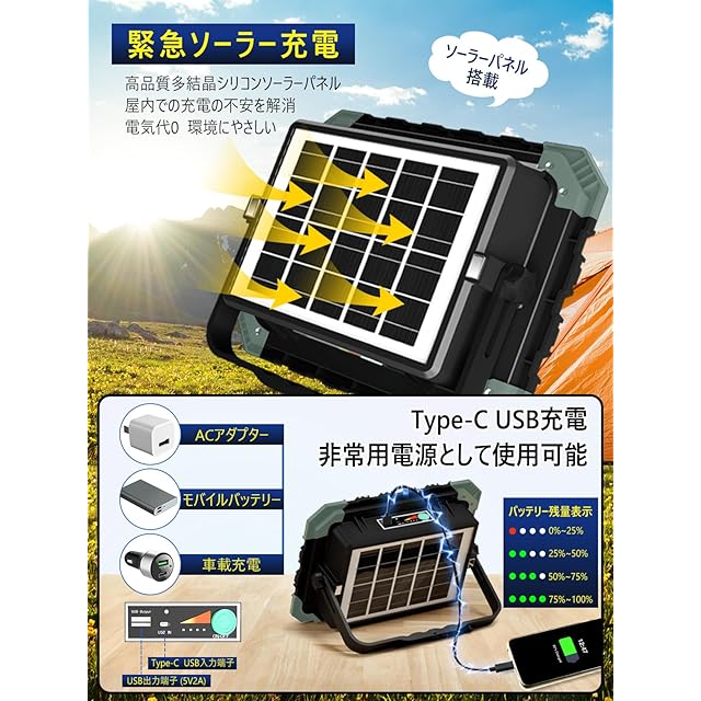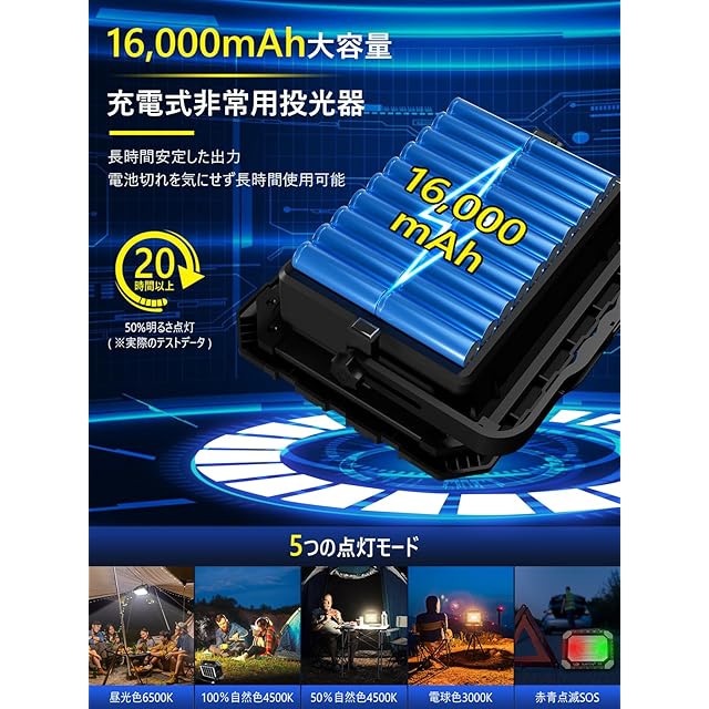 【100%明るさで12時間点灯&16000mAh大容量バッテリー】本充電式作業灯は16,000mAh超大容量バッテリーを内蔵しており、50%自然色モードで20時間以上、100%自然色モードで12時間以上使用可能です。充電機能付き、従来品2倍の充電効率で、充電時間を半分に短縮します。さらに、ソーラー充電パネルとType-c USB充電モードも備えています。屋外でも充電を気にせず使用できる作業灯で、バッテリー残量表示灯も付いており、投光器のバッテリー残量が一目でわかるので、より安心してご使用いただけます。ACアダプター、PC、モバイルバッテリー、車載充電、ポータブル電源などのUSB充電モードです。