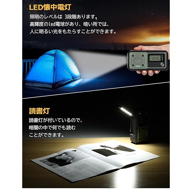 <p><b>1: 製品の紹介</b></p> <p>この製品は、ソフトウェア プログラミングを使用して、FM(76-108MHz)、AM(522-1629KHz)、SW( 3.20-22.00MHz) と全べての帯域に渡りラジオ放送のデジタル選局を実現します。大容量リチウム電池を内蔵して、ソーラーパネル、ハンディダイナモ、DC5Vによる充電をサポートします。</p> <p>外部電源:単4電池 3本による電源供給にも対応しています。ラジオには、読書灯、フラッシュライト、SOS アラーム機能が装備されています。家庭でも屋外でも使える防災用品です。</p> <p><b>2: ラジオの機能</b></p> <p>2.1: 5000mAhの大容量リチウム電池で長持ちします。ソーラーパネル、ハンディダイナモ、DC5V外部電源による充電をサポートします。</p> <p>2.2: ラジオは、単4電池 3本による電源供給もサポートしています。</p> <p>2.3: ラジオは、FM、AM、SW の全帯域信号を高感度に受信します。 7段360°回転可能なロッドアンテナを採用。</p> <p>2.4: ラジオは40mmスピーカーを使用して大音量でクリアなサウンドを備えています。</p> <p>2.5:LCDデジタルディスプレイに表示される多くの情報:周波数、バッテリーレベル、音量、受信モードなど、ユーザーに明確な指示を与えます。</p> <p>2.6: LCDバックライトを備えて夜間でも使いやすい。</p> <p>2.7: ラジオは 3.5 mm イヤホン出力をサポートします。</p> <p>多機能で使いやすいラジオです。ラジオ受信の無限の楽しみを提供し、より多くの方のお役に立てれば幸いです。</p>