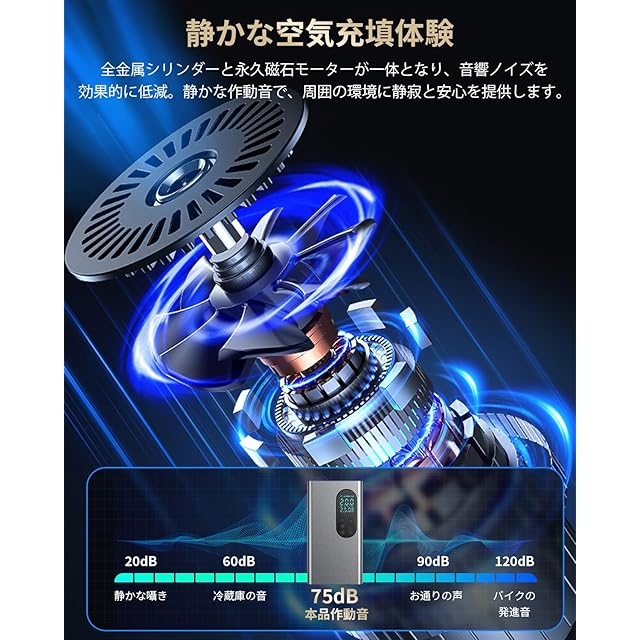 商品名:10秒で充填 空気入れ 車 自転車 電動 スマート 最大圧力150PSI 6000mAh 膨張速度が約30%向上 Type-C充電 自動停止 タイヤ電動空気入れ 小型 LEDライト 電動くうきいれ コードレス充電式 空気圧指定可 自動車タイヤエアーポンプ ロードバイク/バイク/ボール/小型自動車 米式/仏式バルブ対応 エアホースリール 日本語取扱説明書付き