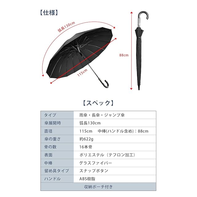 商品名:長傘 【大きいサイズ 頑丈な16本骨】 傘 メンズ 直径115cm 高強度グラスファイバー 丈夫 雨傘 超撥水 耐強風 ワンタッチ ジャンプ傘 埋め込みボタン 軽量 メンズ レディース 男女兼用 大判 紳士傘 晴雨兼用傘 収納ポーチ付き 父の日プレゼント (ブラック)