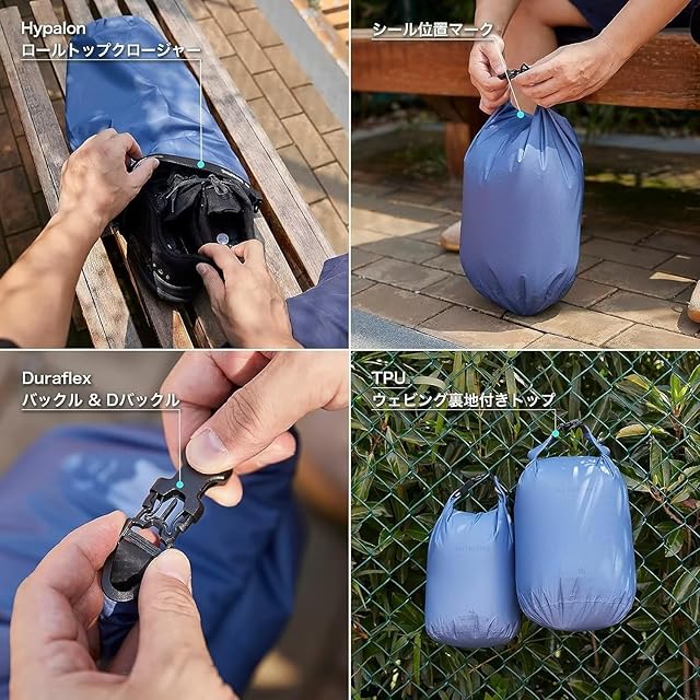 便利なギア - 2L/4L/8Lサイズ、2Lは軽食、旅行の必需品、手袋、帽子などに適しています;4Lはシェルジャケット、手袋、ビーニーなどに適しています;8Lドライバッグは、ダウン製寝袋、または替えの衣類の収納に適しています。