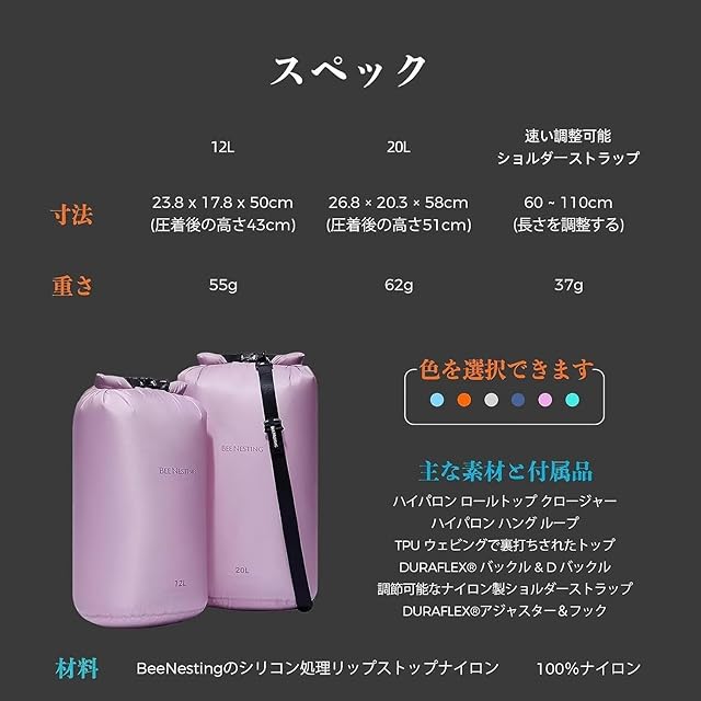 62g 超軽量 - 超軽量ドライ バッグ ラージ セットには、20L、およびクイック調整ナイロン ショルダー ストラップが含まれます。軽量素材により、サックの総重量はわずか 62gに抑えられます。快適で持ち運びが簡単です。