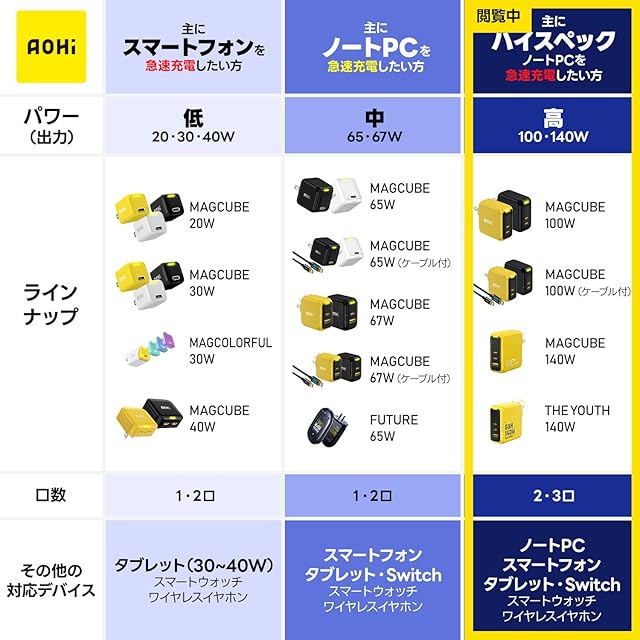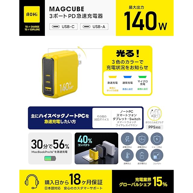 AOHI 140W 充電器 Type-C 3ポート 【Gan+搭載(超小型・高効率充電・過熱防止)/PD/PSE認証/折りたたみ式プラグ/充電ステータスライト】 MacBook pro iPhone Android Samsung Galaxy ipad AirPods AppleWatch Switch 急速充電器 MAGCUBE イエロー EN-MC140YL1