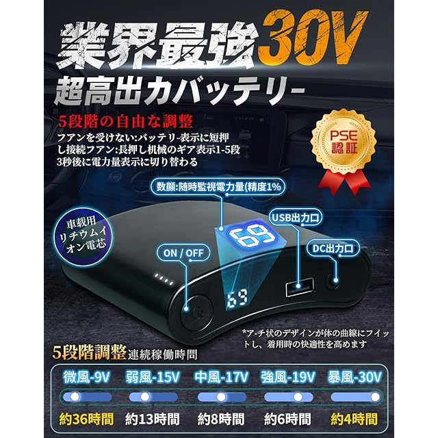 【30V超高出力バッテリー】新開発の高圧出力超大容量20000mAhバッテリー、5段階調節、電量ランプ表示あり、専用充電器付属。バッテリーのスイッチを長押しするとスイッチが入り、一般的な電気安全基準に加え、厳しいPSE認証を取得しています。人体に害はありませんので、長期間安心してご利用いただけます。2段階の出力モード:冷風機を接続しない場合、30Vの超大出力を実現します。冷風機を接続すると、冷風機の動作に適した12V出力に調整されます。扇風機の風量は5段階に切り替えることができ、風量によって使用時間は約4〜36時間になります(扇風機のモードによって異なります)