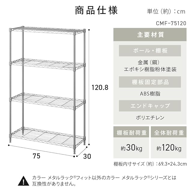 アイリスオーヤマ カラーメタルラックフィット 4段 幅75×奥行き30×高さ121cm CMFー75120 グレージュ