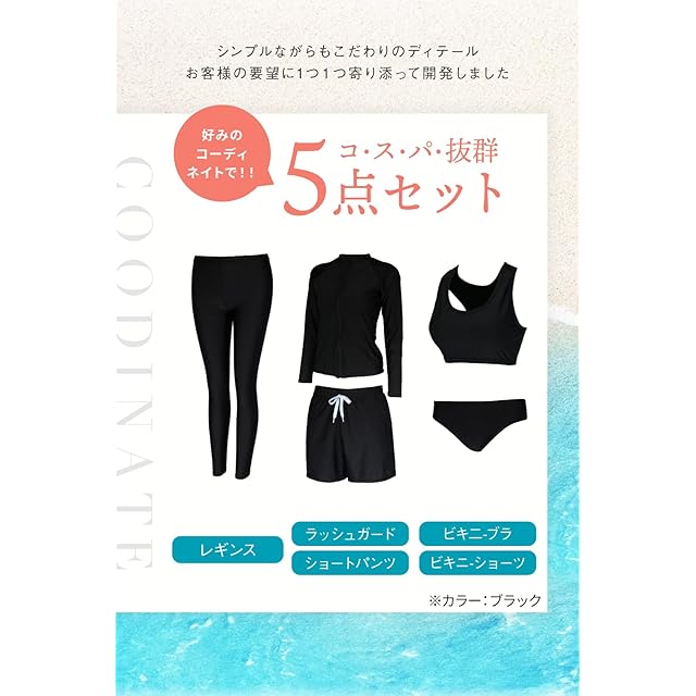 [AQXIA] ラッシュガード レディース 5点セット (プロウェイクボーダー推薦) 水着 体型カバー レギンス タンキニ ブラック L